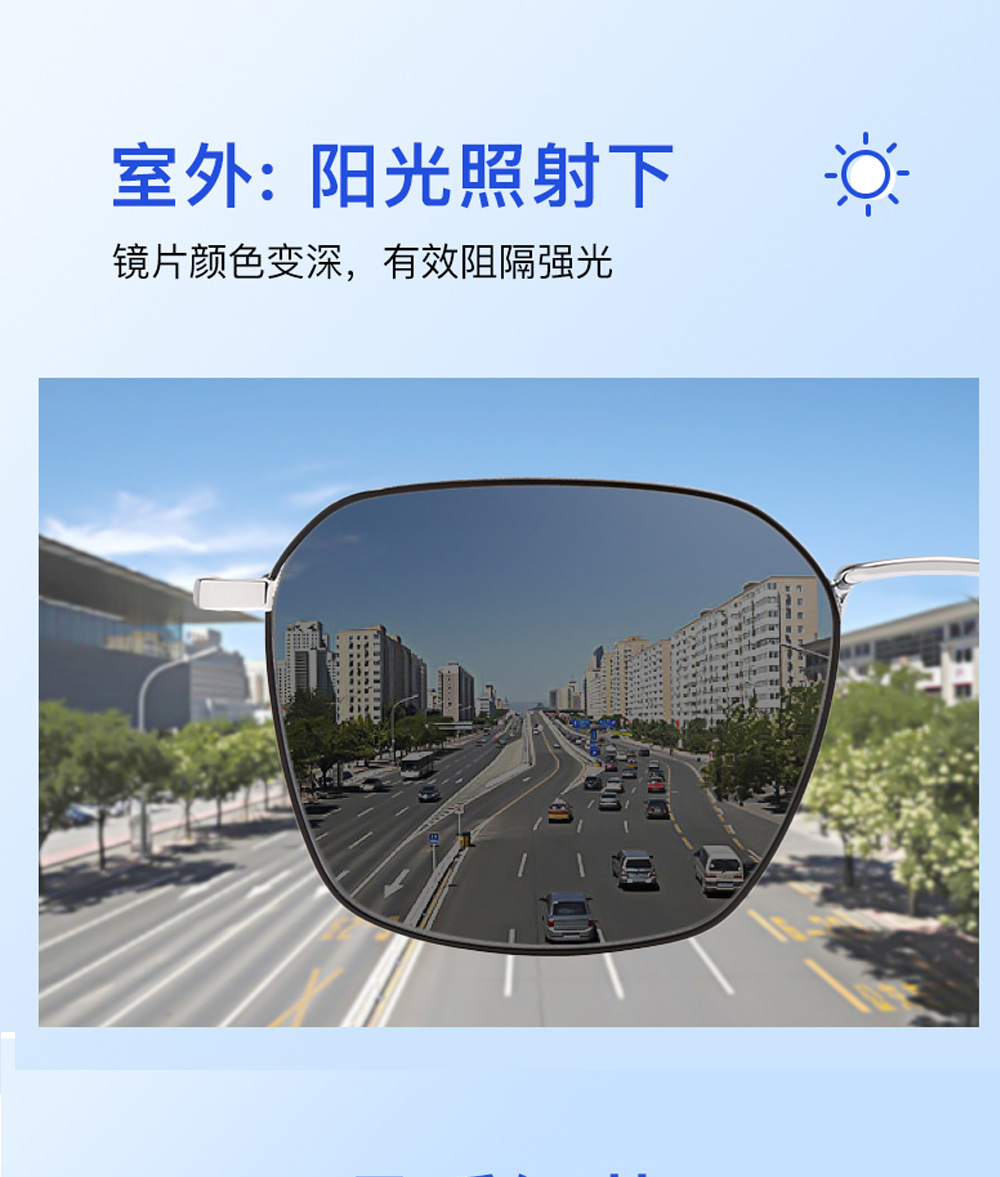 2.强效遮光,阻隔紫外线伤害变色眼镜能根据光线和温度自动变色,通过镜片变色调节透光度,使人眼适应环境光线的变化。